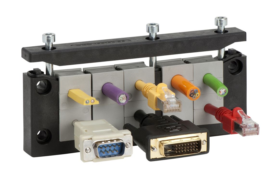 | | Hybridfähige Kabeleinführung mit neuer KT-M von icotek möglich Mit der neuen KT-M Kabeltülle von icotek werden Einbaustecker und Einbaubuchsen direkt in die icotek Kabeleinführungsleisten KEL, KEL-U oder KEL-ER integriert. Die KT-M bietet sich hervorragend an, um eine Schnittstelle für Signal-, Daten-, Leistungs- oder Hybridsteckverbinder zu schaffen, indem diese einfach in das Gewinde der KT-M eingeschraubt werden. Auch Schlauchverschraubungen oder Druckausgleichselemente lassen sich an der KT-M problemlos einschrauben. Die Tülle KT-M ist auf Basis einer KT Kabeltülle groß aufgebaut. In dieser Tülle ist ein Polyamidkorpus integriert. Verfügbar ist die KT-M mit Innengewinde M12x1,0, M16x1,5, M20x1,5 und M25x1,5. Alternativ ist die Blindtülle KT-M blind erhältlich. In der KT-M blind ist ein einseitig vollständig geschlossener Polyamidkorpus integriert. Die Nutzfläche beträgt 24x24mm, die Wandstärke 6mm. Hier können Sonderbohrungen vorgenommen bzw. auch kleinere Flanschbuchsen (z.B. für Hybrid-Gerätesteckverbinder) angebracht werden. | |